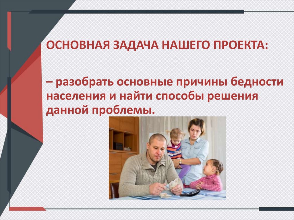 ОСНОВНАЯ ЗАДАЧА НАШЕГО ПРОЕКТА:– разобрать основные причины бедности
