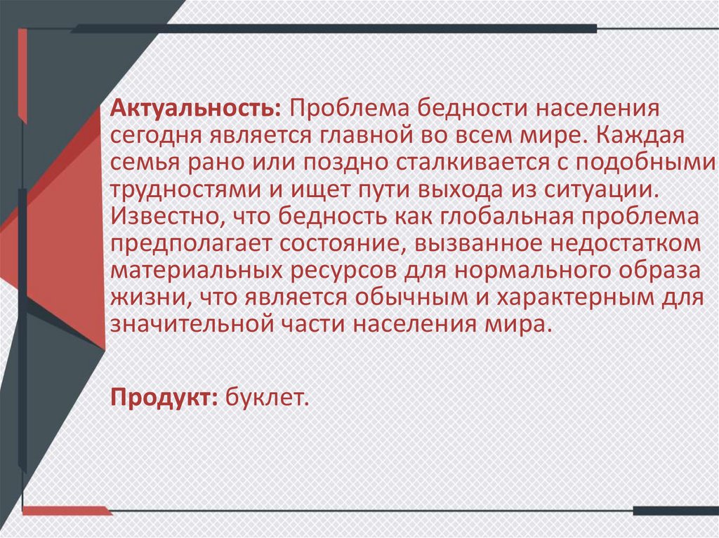 Актуальность: Проблема бедности населениясегодня является главной во всем мире. Каждая