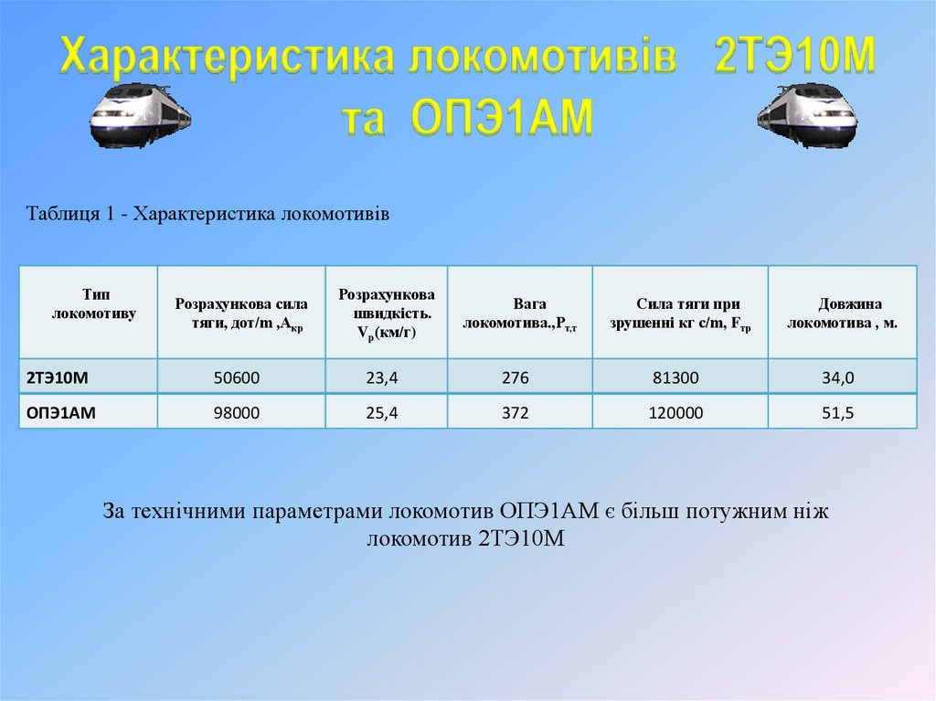 Таблиця 1 - Характеристика локомотивівРозрахункова сила