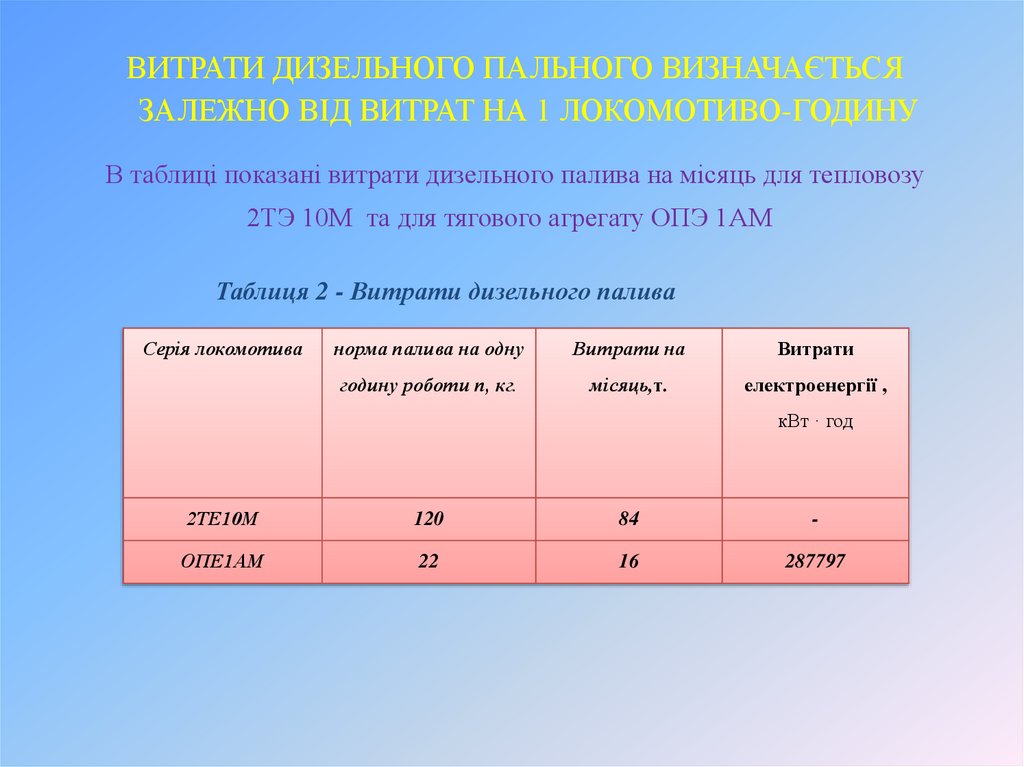 ВИТРАТИ ДИЗЕЛЬНОГО ПАЛЬНОГО ВИЗНАЧАЄТЬСЯЗАЛЕЖНО ВІД ВИТРАТ НА 1 ЛОКОМОТИВО-ГОДИНУ