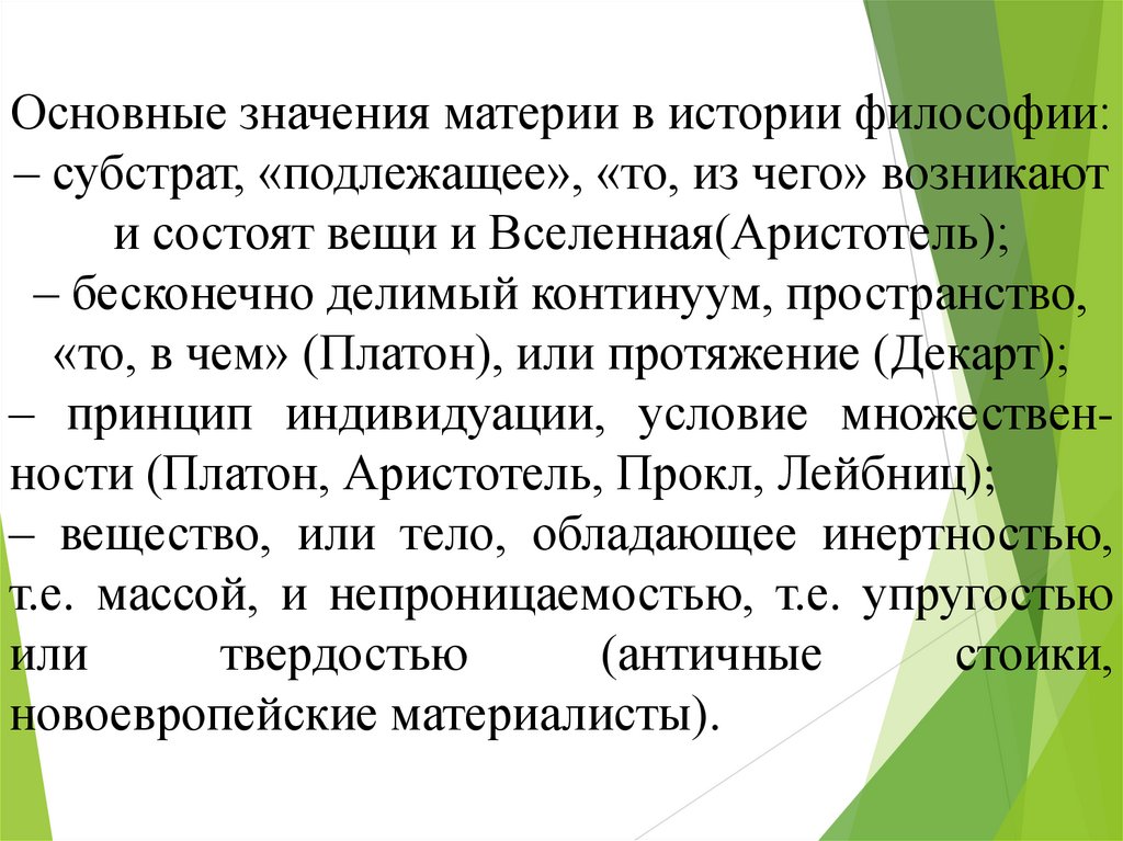Основные значения материи в истории философии:– субстрат, «подлежащее», «то, из чего» возникают