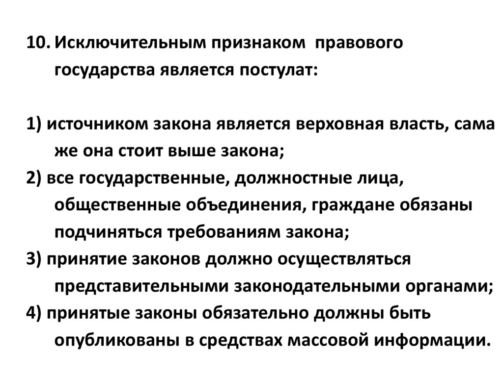 10. Исключительным признаком правовогогосударства является постулат: