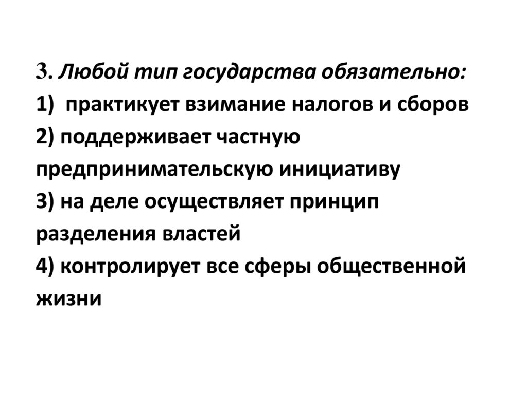 3. Любой тип государства обязательно:1) практикует взимание налогов и сборов