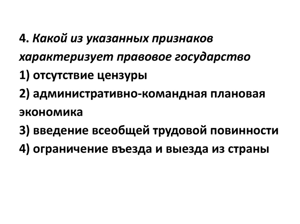 4. Какой из указанных признаковхарактеризует правовое государство