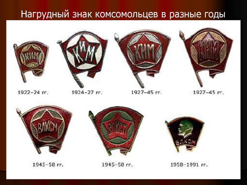 Нагрудный знак комсомольцев в разные годы9.