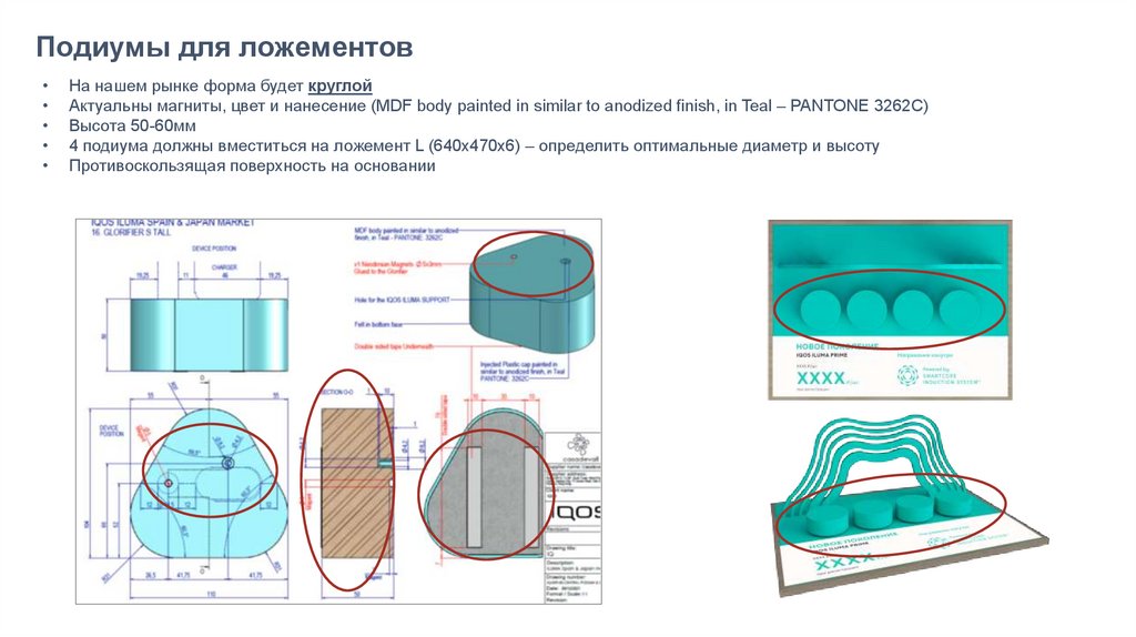 • 4 подиума должны вместиться на ложемент L (640x470x6) – определить оптимальные диаметр и высоту