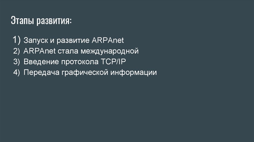 Этапы развития:1) Запуск и развитие ARPAnet