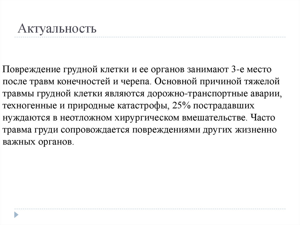 АктуальностьПовреждение грудной клетки и ее органов занимают 3-е место