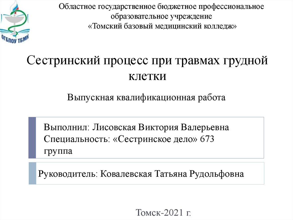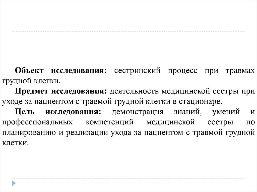 Объект исследования: сестринский процесс при травмахгрудной клетки.
