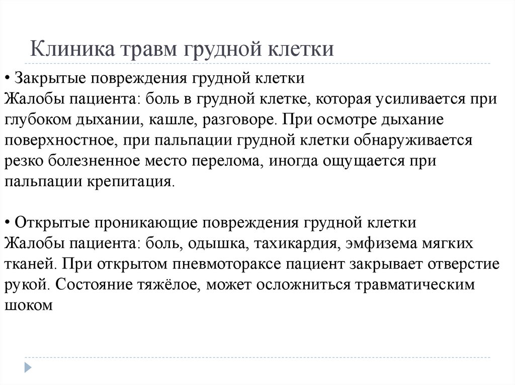 Клиника травм грудной клетки• Закрытые повреждения грудной клетки