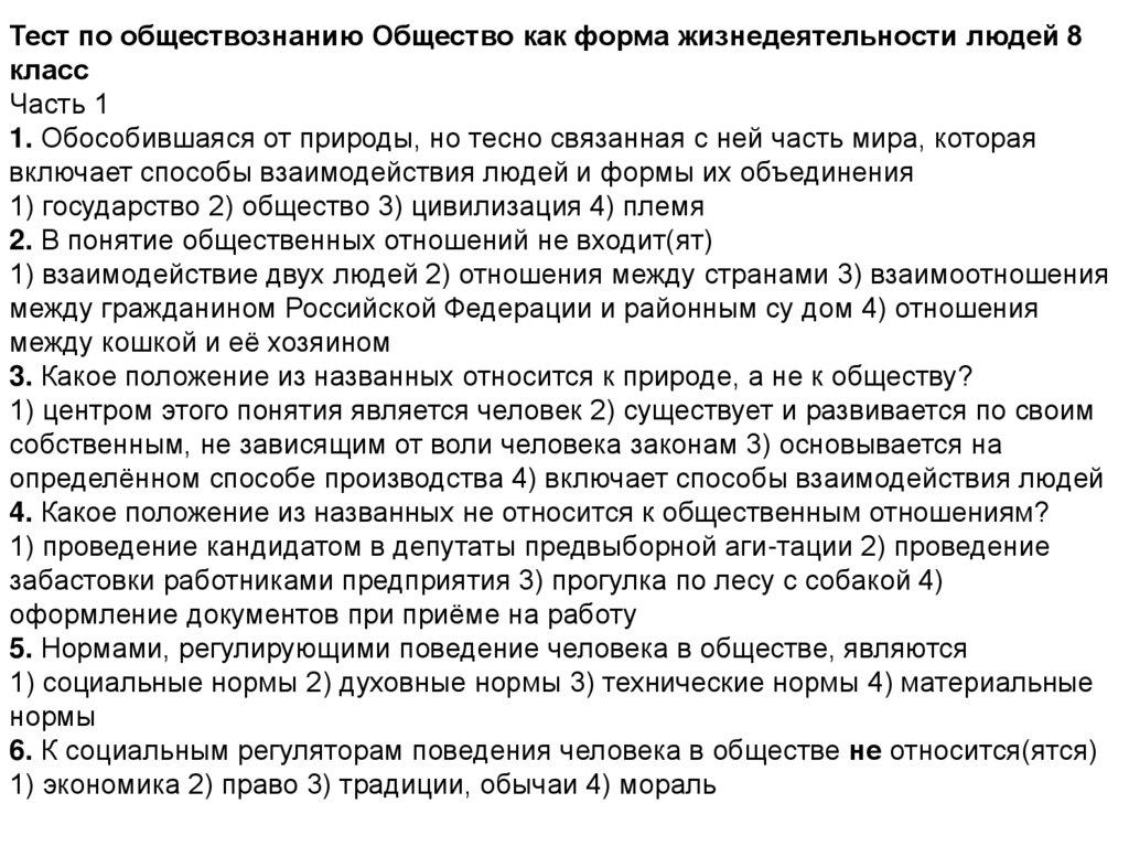 Тест по обществознанию Общество как форма жизнедеятельности людей 8класс