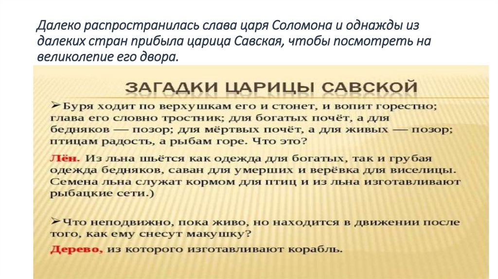 Далеко распространилась слава царя Соломона и однажды издалеких стран прибыла царица Савская, чтобы посмотреть на