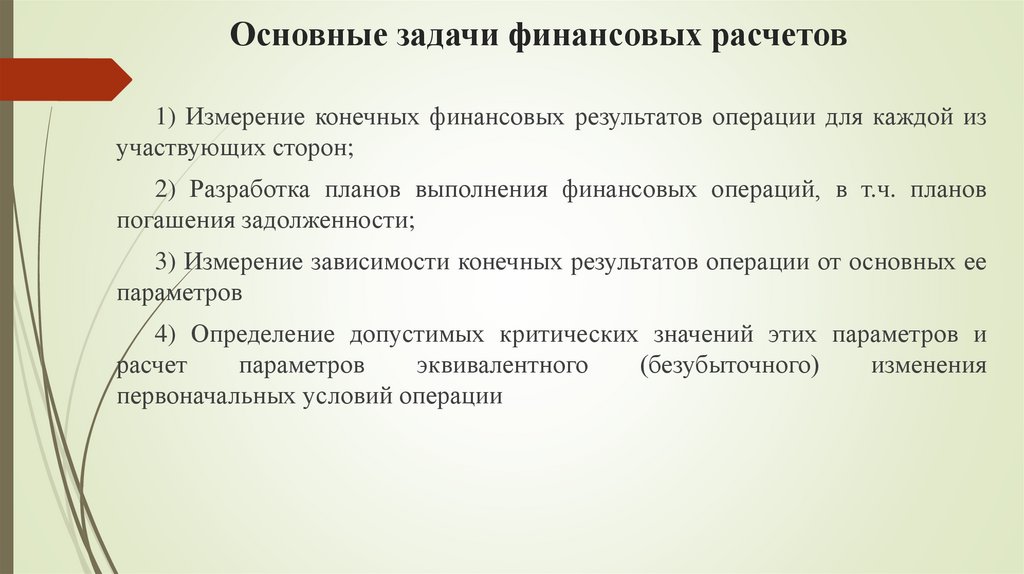 Основные задачи финансовых расчетов1) Измерение конечных финансовых результатов операции для каждой из