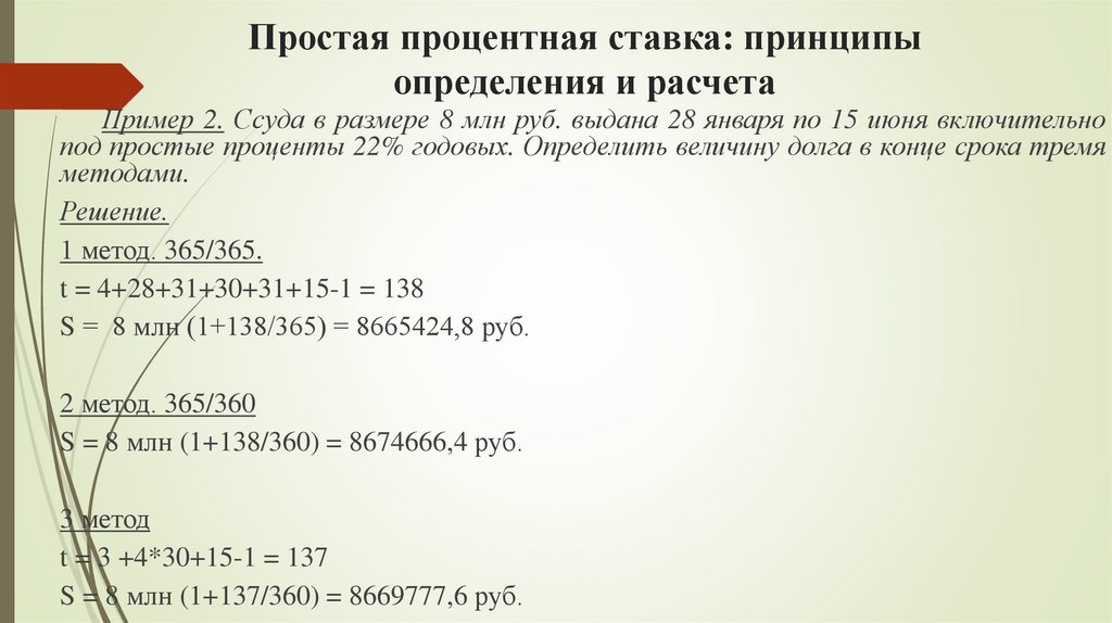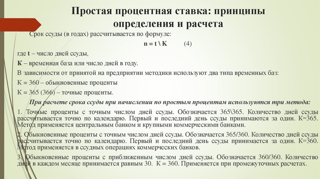 При расчете срока ссуды при начислении по простым процентам используются три метода: