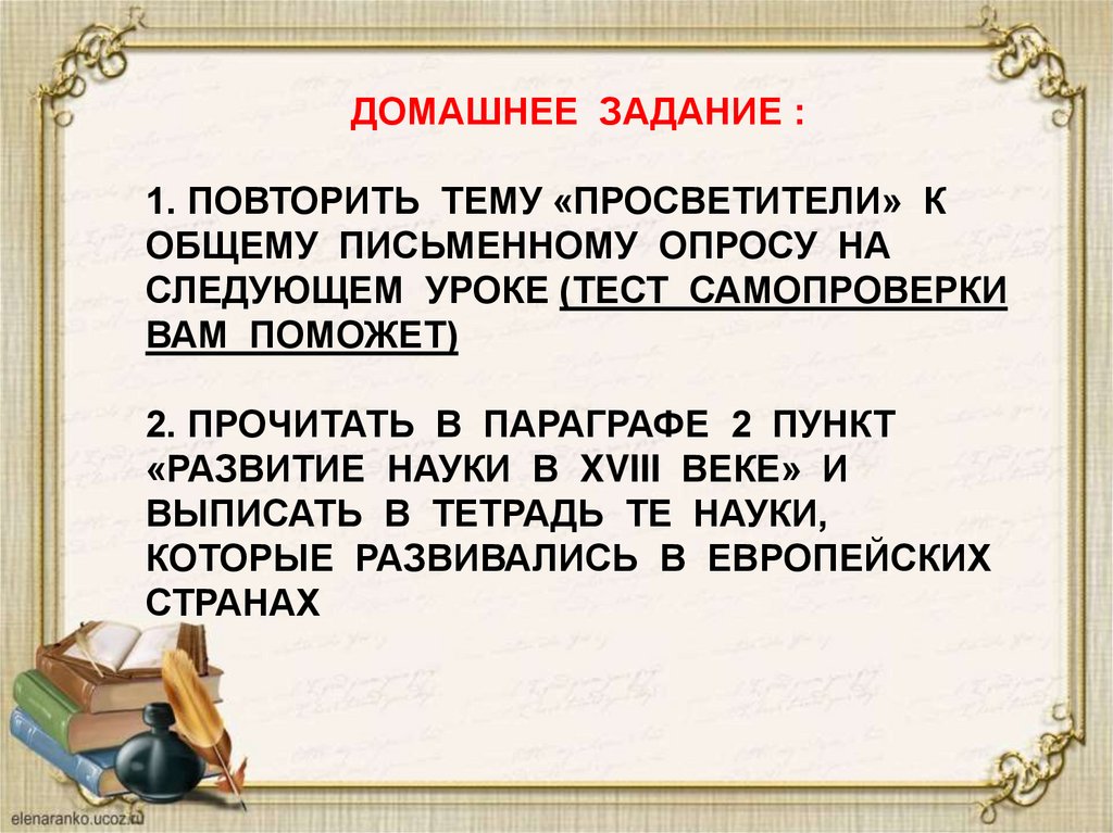 ДОМАШНЕЕ ЗАДАНИЕ :1. ПОВТОРИТЬ ТЕМУ «ПРОСВЕТИТЕЛИ» К