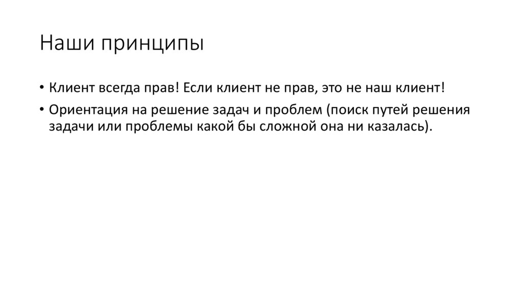 Наши принципы• Клиент всегда прав! Если клиент не прав, это не наш клиент!