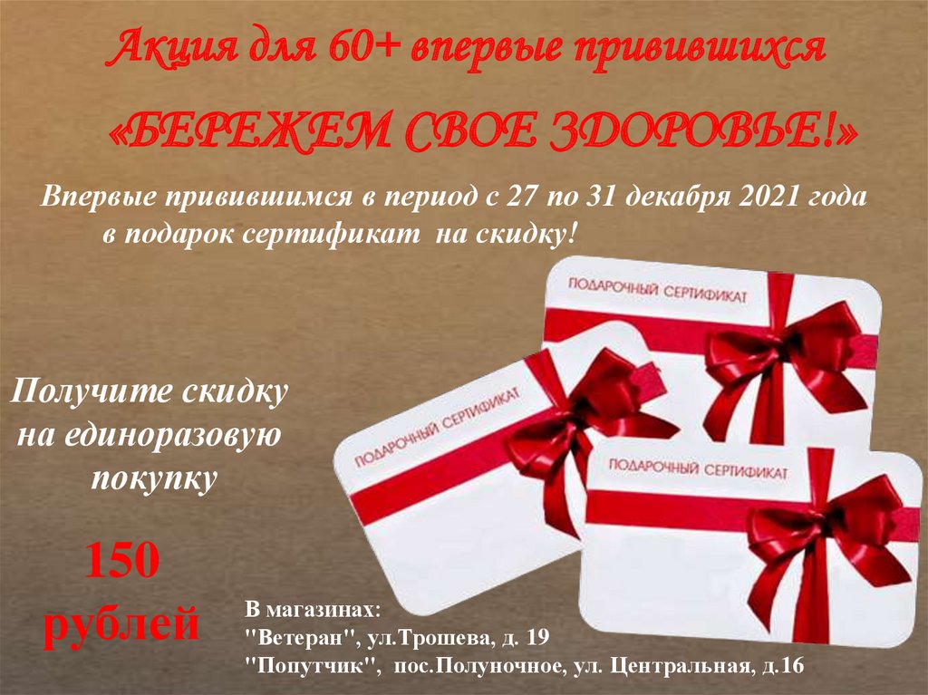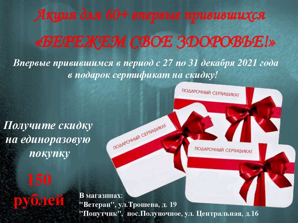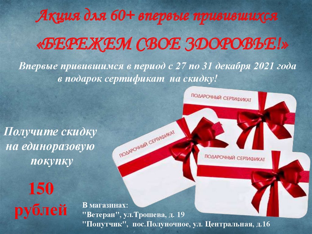 Акция для 60+ впервые привившихся«БЕРЕЖЕМ СВОЕ ЗДОРОВЬЕ!»