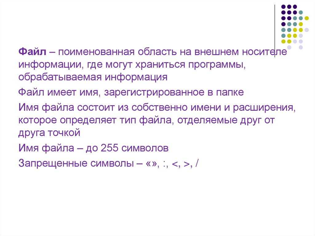 Файл – поименованная область на внешнем носителеинформации, где могут храниться программы,