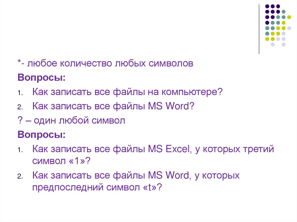 *- любое количество любых символовВопросы: