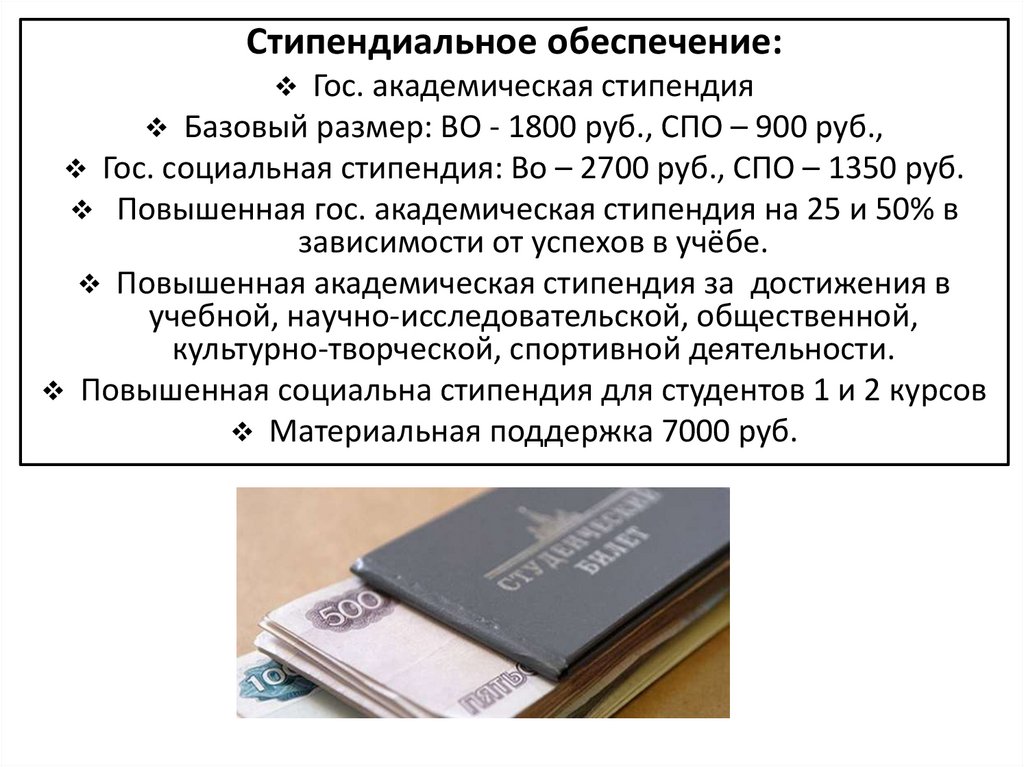 Гос. социальная стипендия: Во – 2700 руб., СПО – 1350 руб.