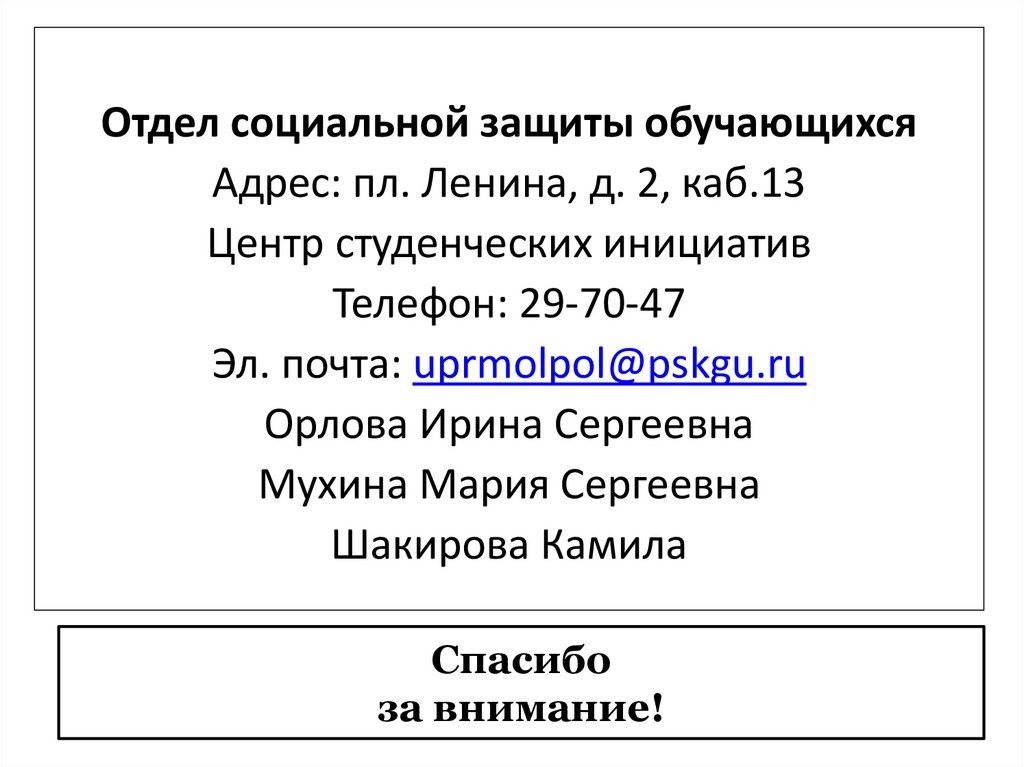 Отдел социальной защиты обучающихсяАдрес: пл. Ленина, д. 2, каб.13