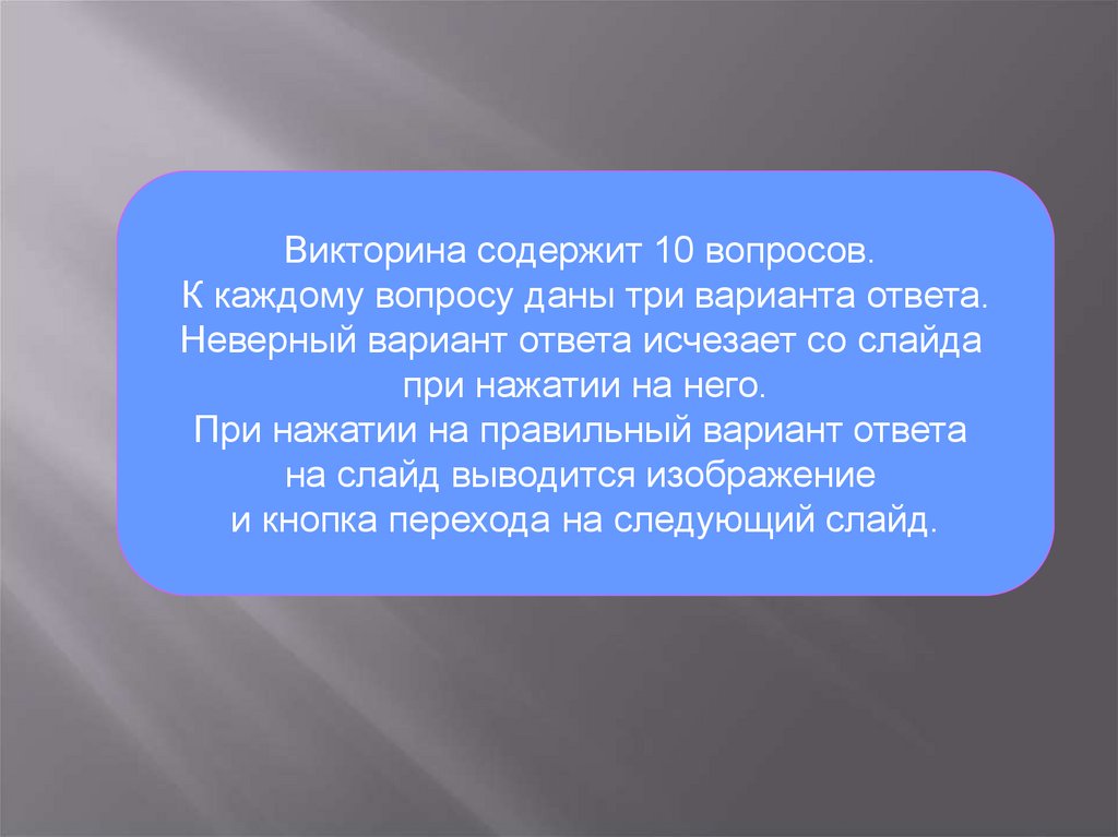 Викторина содержит 10 вопросов.К каждому вопросу даны три варианта ответа.