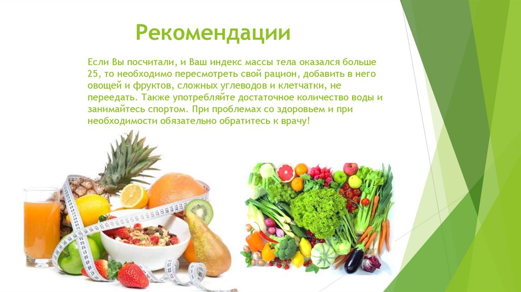РекомендацииЕсли Вы посчитали, и Ваш индекс массы тела оказался больше