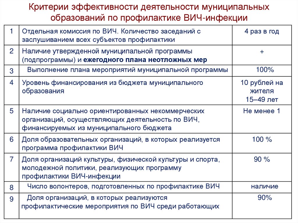 Критерии эффективности деятельности муниципальныхобразований по профилактике ВИЧ-инфекции