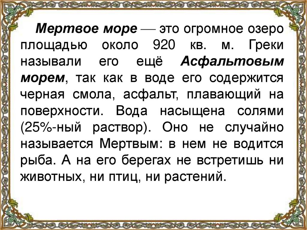 Мертвое море это огромное озероплощадью около 920 кв. м. Греки