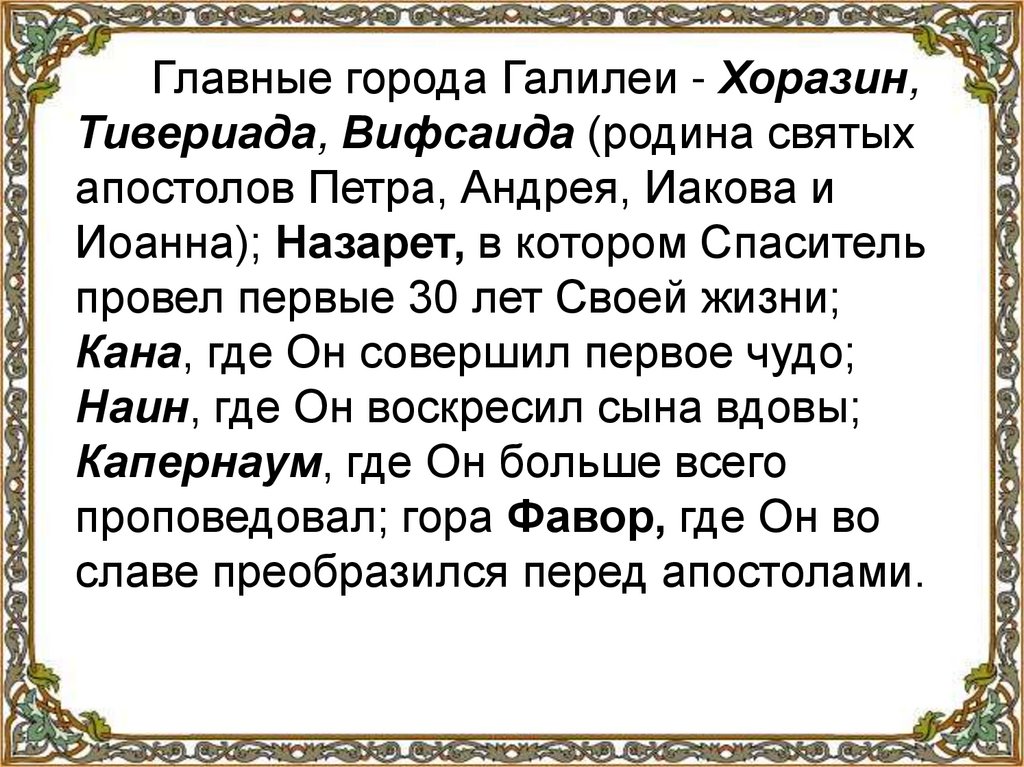 Главные города Галилеи - Хоразин,Тивериада, Вифсаида (родина святых