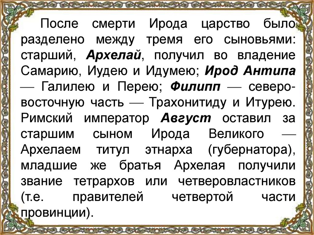 После смерти Ирода царство былоразделено между тремя его сыновьями: