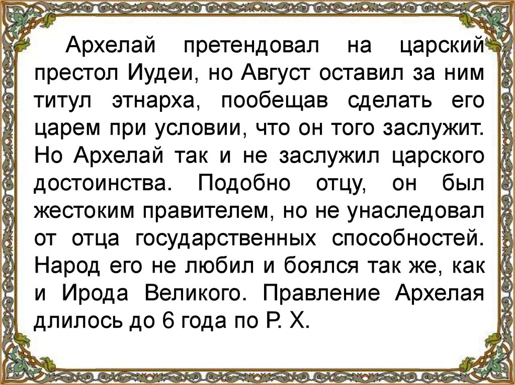 Архелай претендовал на царскийпрестол Иудеи, но Август оставил за ним
