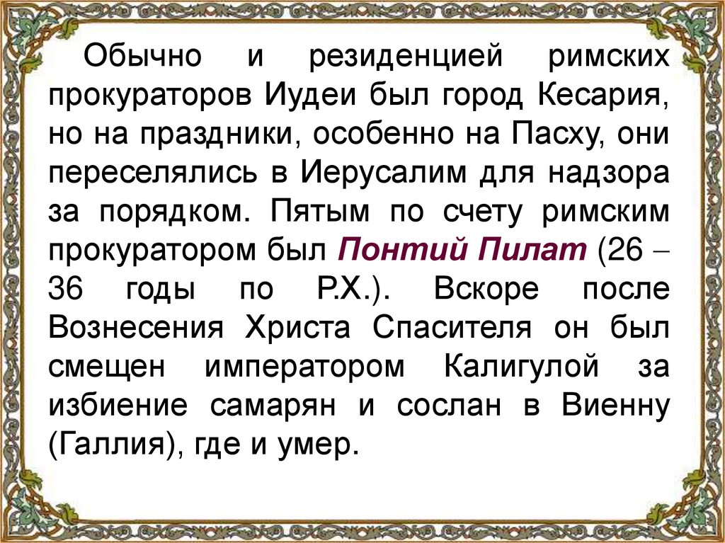 Обычно и резиденцией римскихпрокураторов Иудеи был город Кесария,
