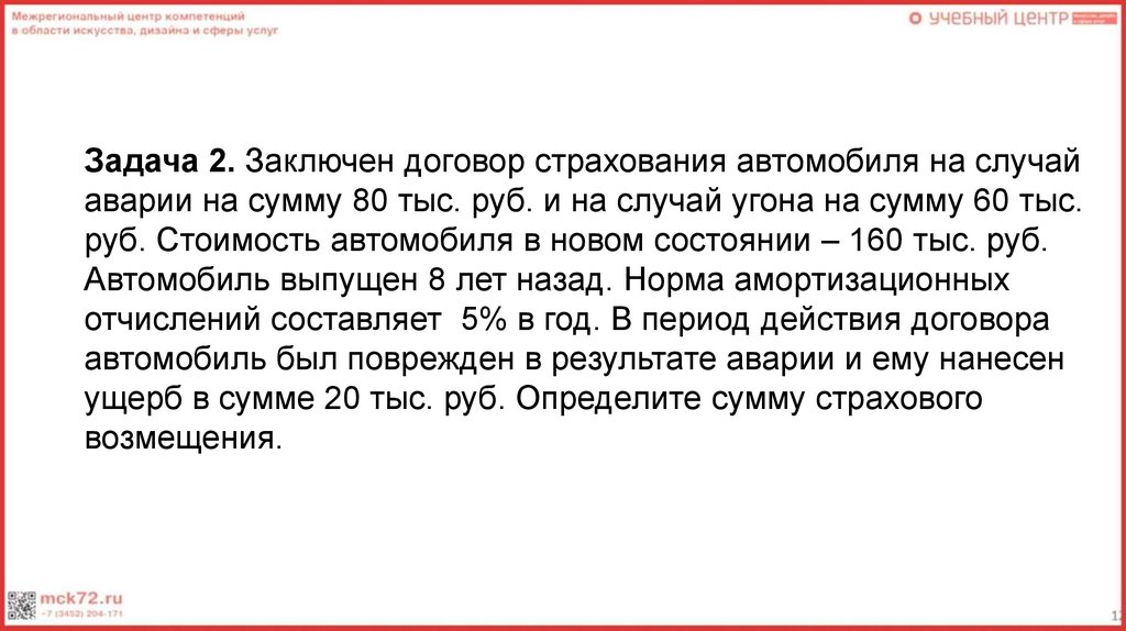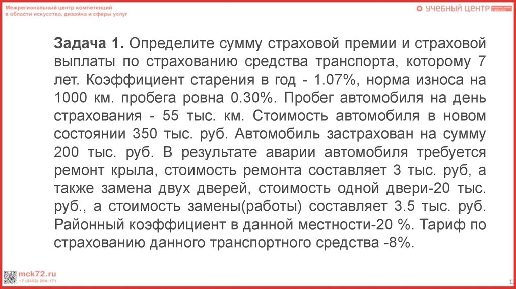Задача 1. Определите сумму страховой премии и страховойвыплаты по страхованию средства транспорта, которому 7