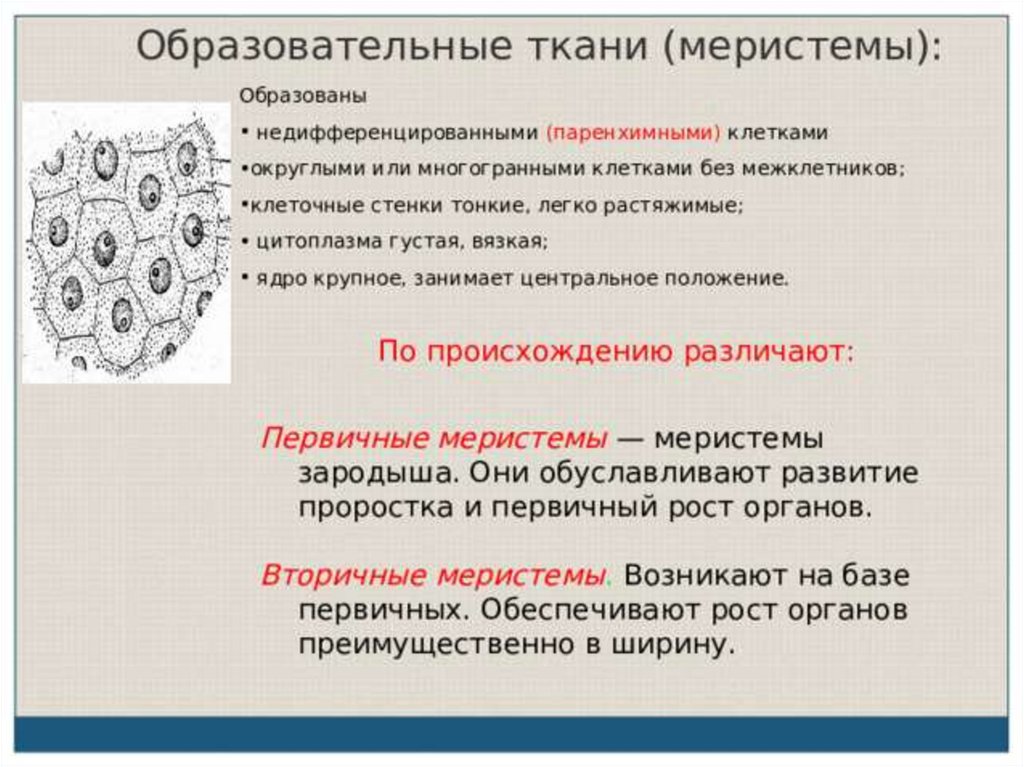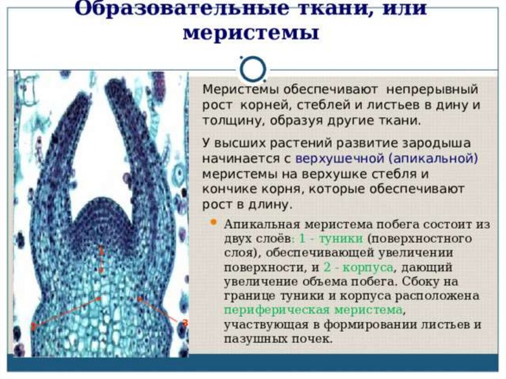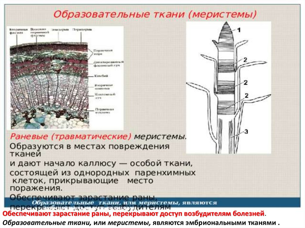 Обеспечивают зарастание раны, перекрывают доступ возбудителям болезней.Образовательные ткани, или меристемы, являются эмбриональными тканями .