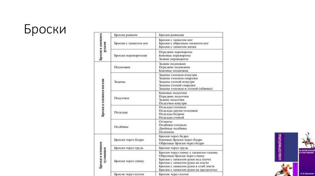 • Бросками называются приемы, в результате проведения которых противник переводится из положения стоя на спину или на бок.