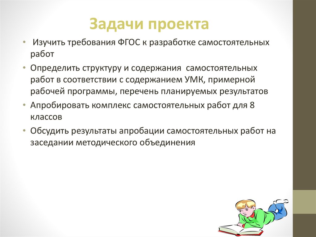 Задачи проекта• Изучить требования ФГОС к разработке самостоятельных