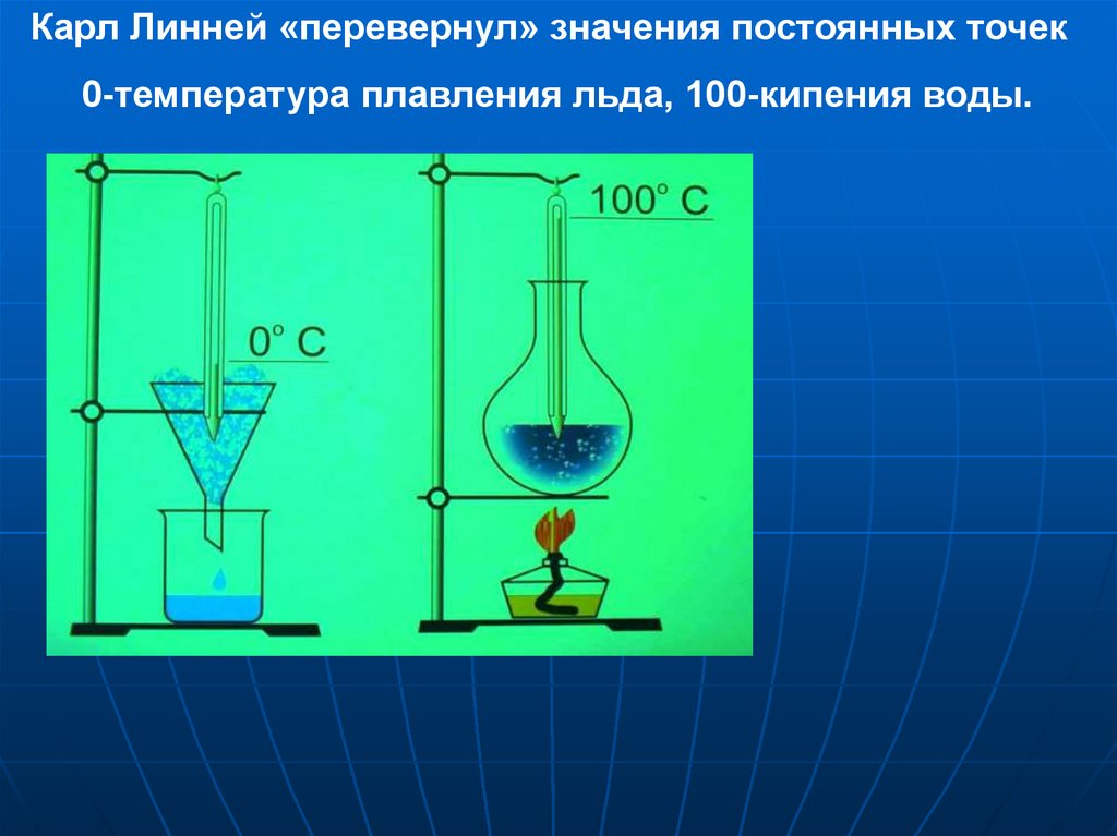 Карл Линней «перевернул» значения постоянных точек0-температура плавления льда, 100-кипения воды.