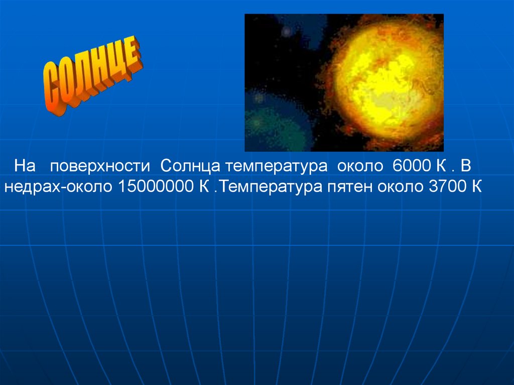 На поверхности Солнца температура около 6000 К . Внедрах-около 15000000 К .Температура пятен около 3700 К