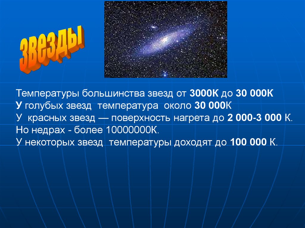 Температуры большинства звезд от 3000К до 30 000КУ голубых звезд температура около 30 000К