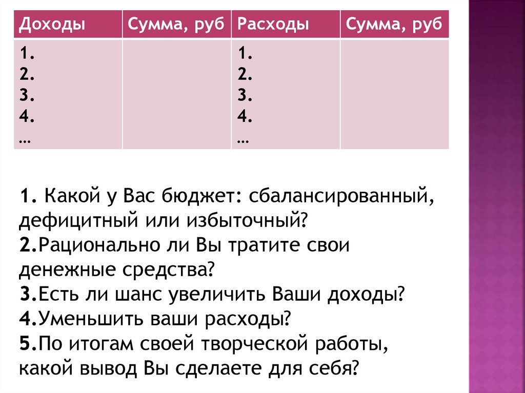 1. Какой у Вас бюджет: сбалансированный,