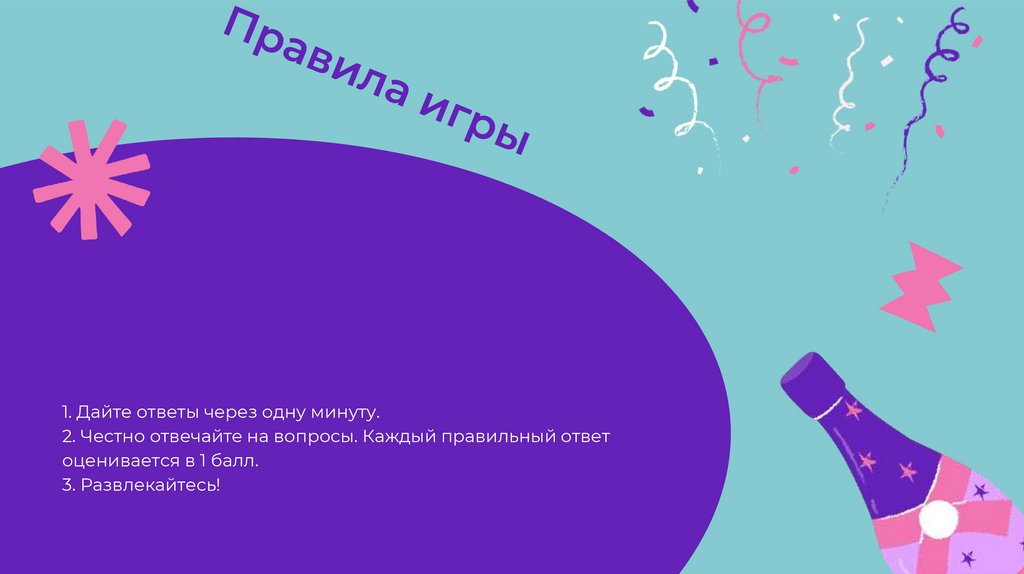 1. Дайте ответы через одну минуту.2. Честно отвечайте на вопросы. Каждый правильный ответ