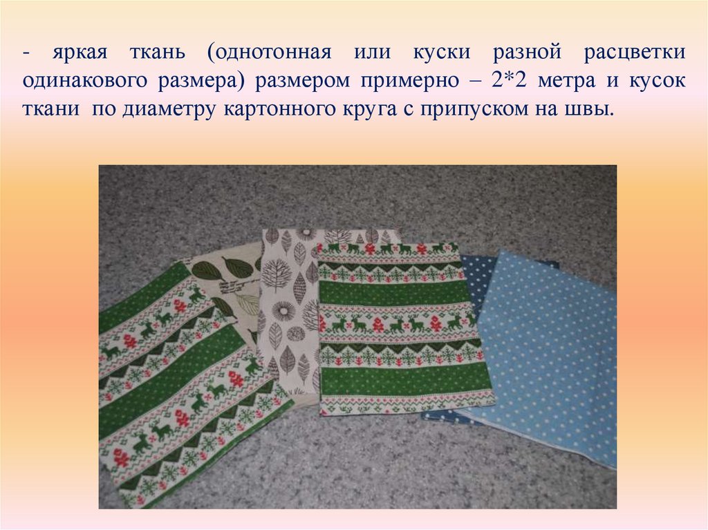 - яркая ткань (однотонная или куски разной расцветкиодинакового размера) размером примерно – 2*2 метра и кусок