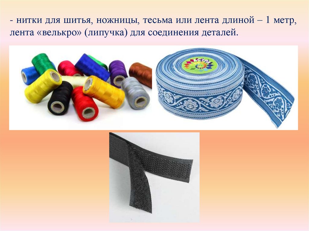 - нитки для шитья, ножницы, тесьма или лента длиной – 1 метр,лента «велькро» (липучка) для соединения деталей.