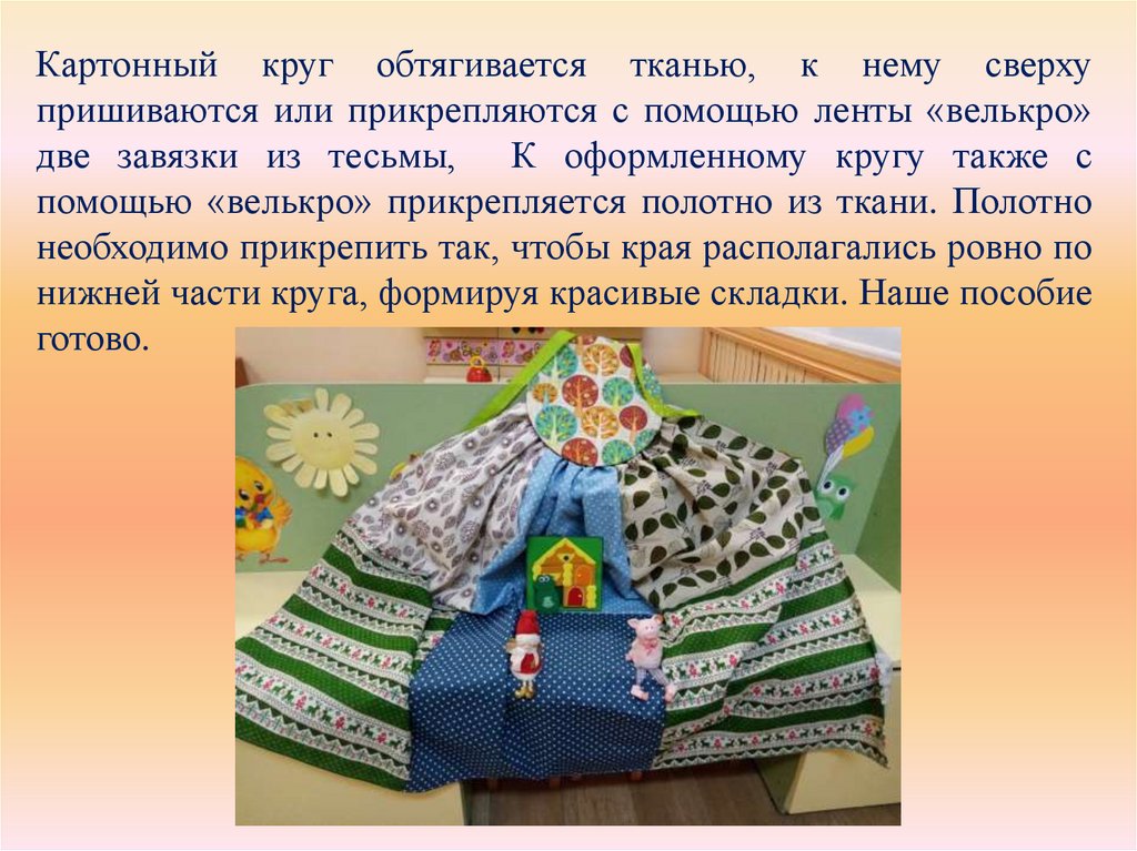 Картонный круг обтягивается тканью, к нему сверхупришиваются или прикрепляются с помощью ленты «велькро»