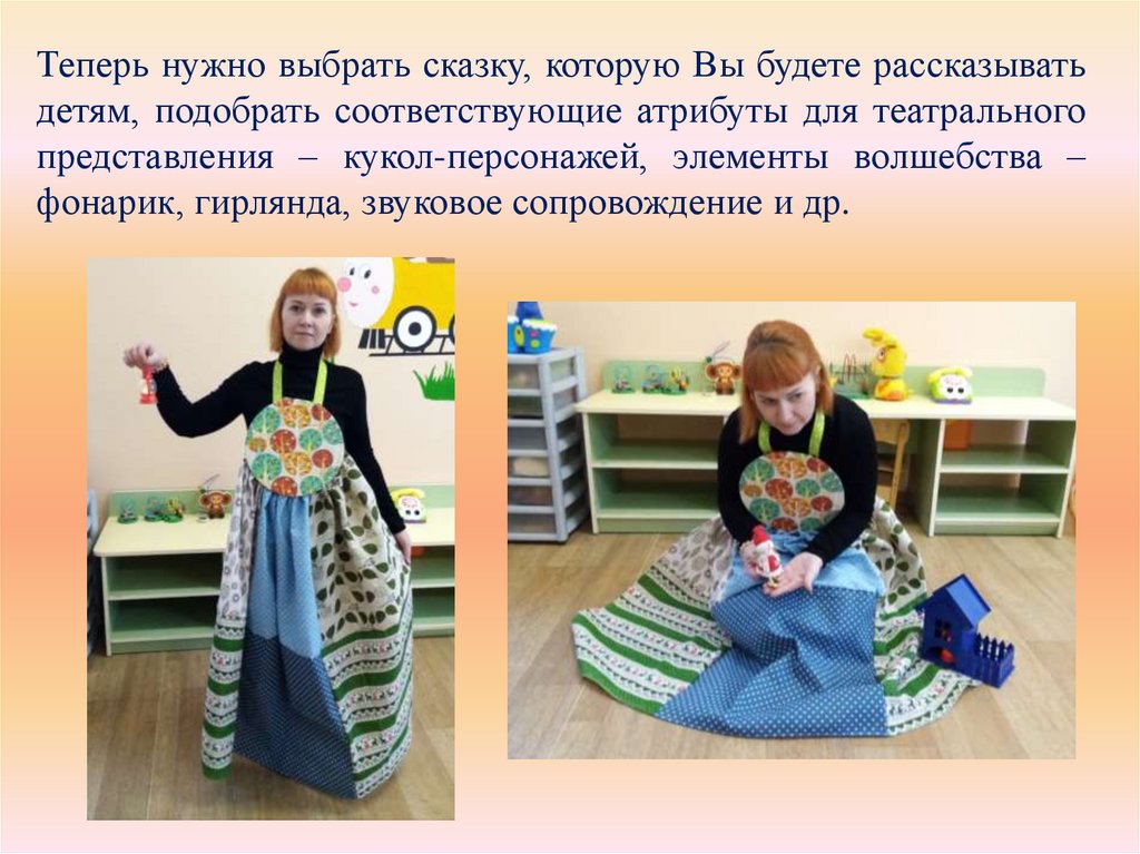 Теперь нужно выбрать сказку, которую Вы будете рассказыватьдетям, подобрать соответствующие атрибуты для театрального