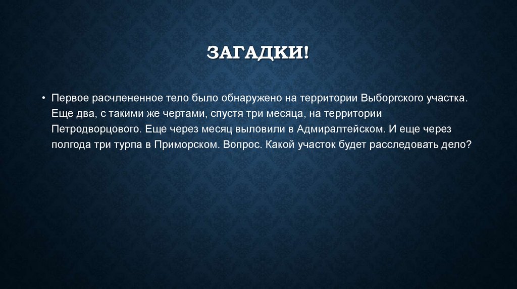 ЗАГАДКИ!• Первое расчлененное тело было обнаружено на территории Выборгского участка.