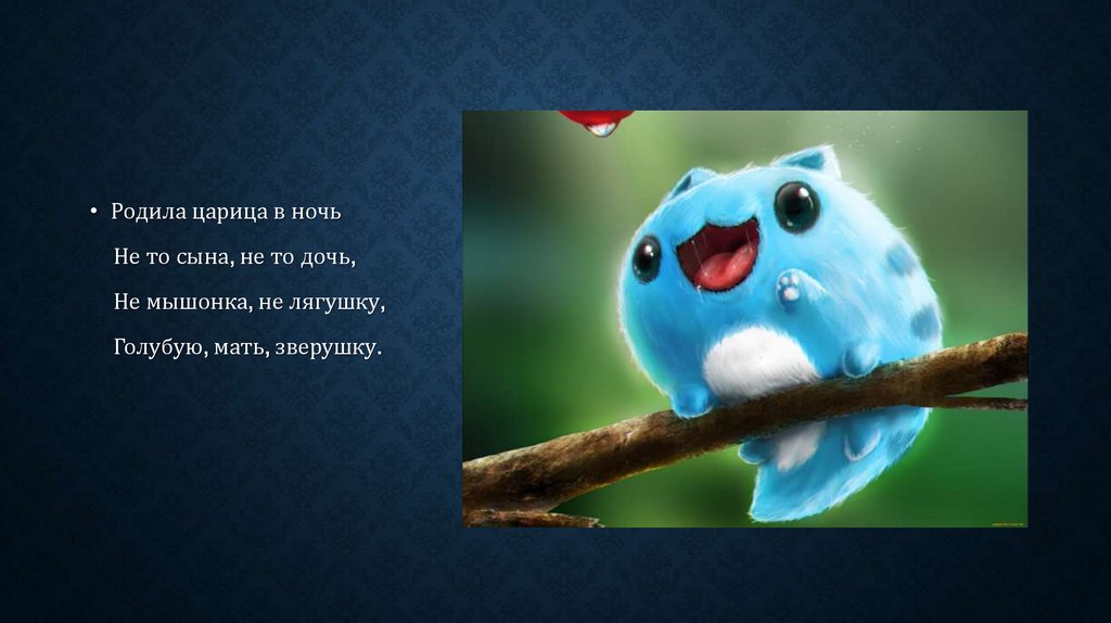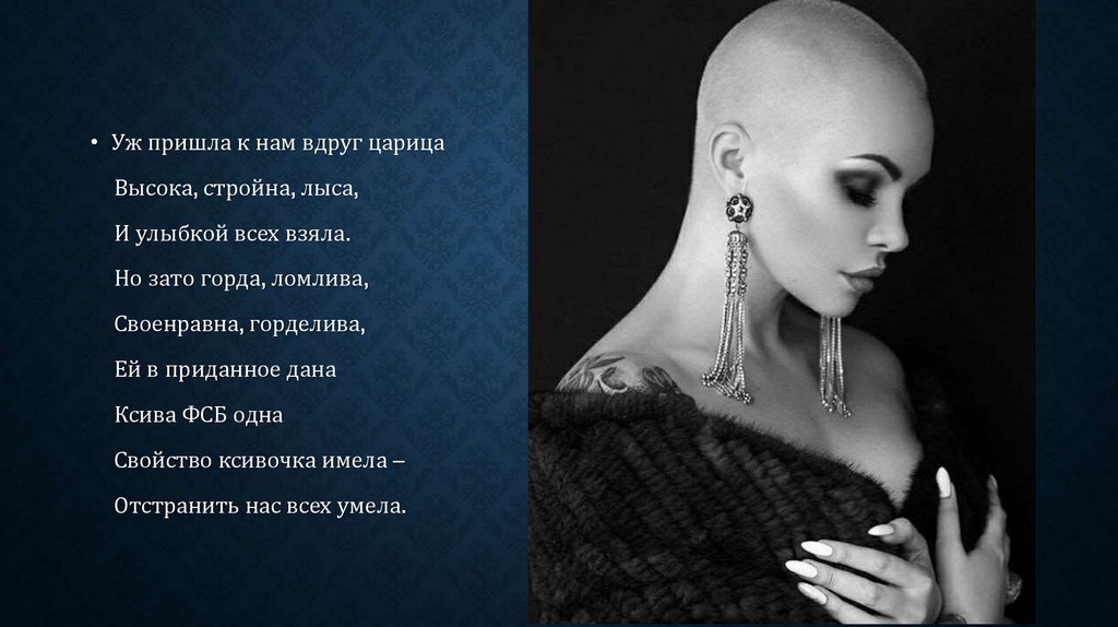 • Уж пришла к нам вдруг царицаВысока, стройна, лыса,