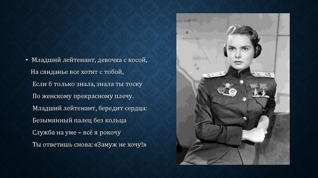 • Младший лейтенант, девочка с косой,На свиданье все хотят с тобой,