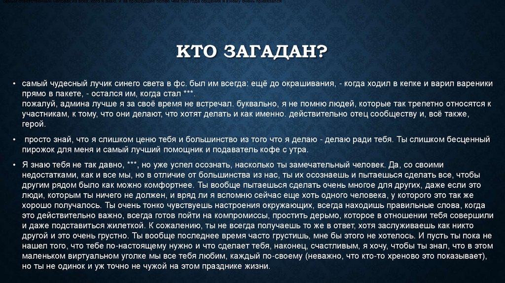 самый ответственный человек из всех, кого я знаю, и за прошедшие более чем пол года общения я к нему очень привязалсяКТО ЗАГАДАН?